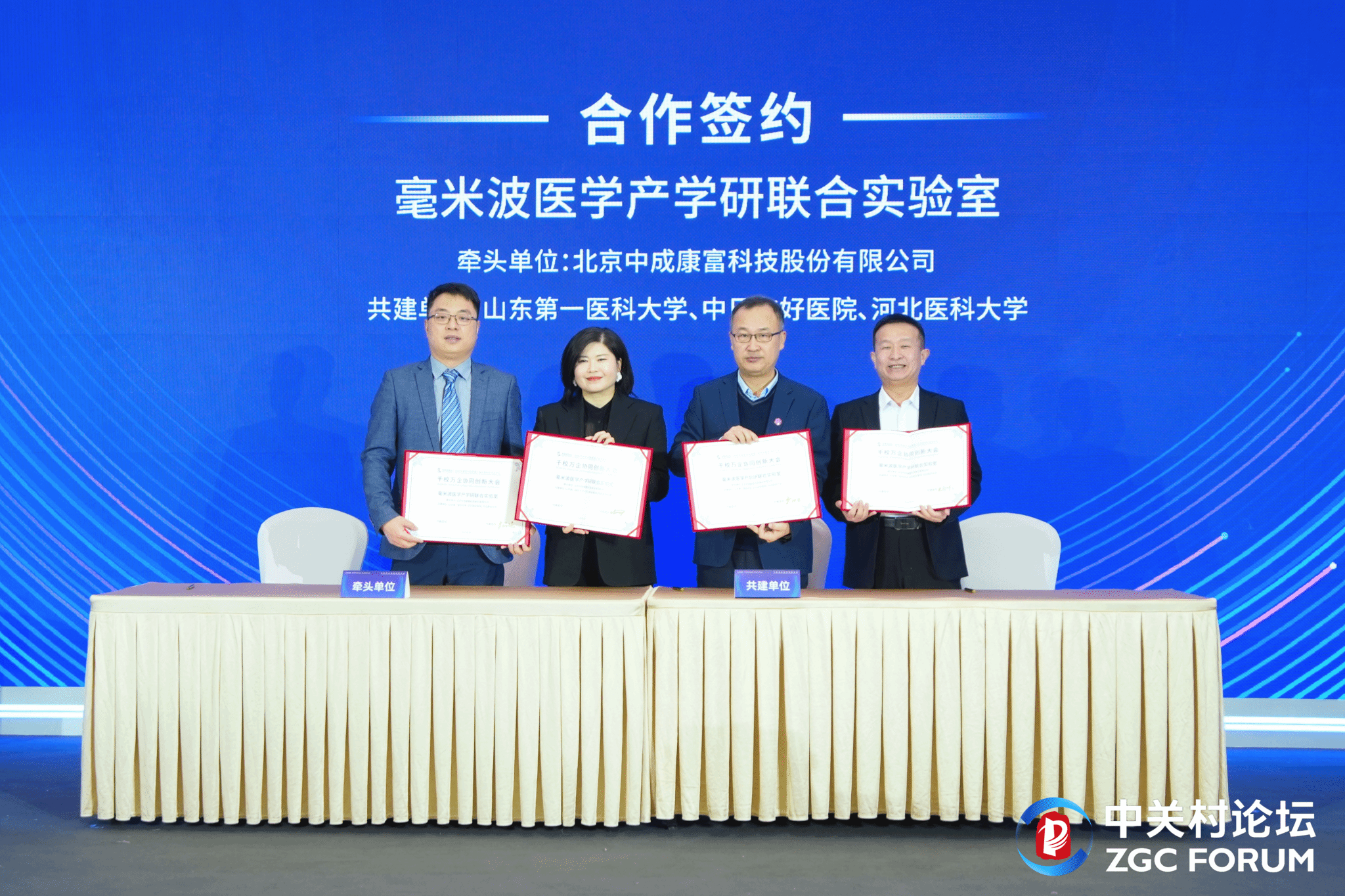 本次论坛举行了“产学研联合实验室签约仪式”,由北京中成康富科技股份有限公司(以下简称“中成康富”)牵头组建的“毫米波医学产学研联合实验室”正式签约成立,协同构建单位包括山东第一医科大学、中日友好医院、河北医科大学。