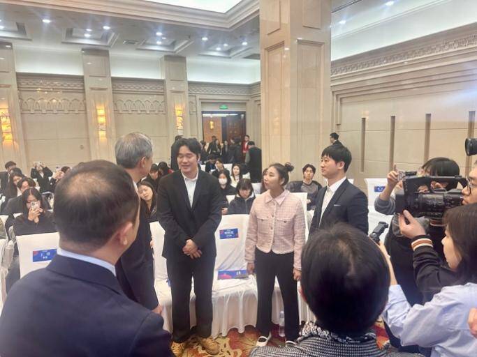 座谈会上,唐鸿福老师与韩国驻华大使卢载宪先生进行了亲切交流。唐老师向大使介绍了自己与夫人在中国相识、相恋并组建中韩多文化家庭的经历,并围绕中韩青年学术互动、教育合作以及医疗健康领域的跨国交流等话题进行了深入沟通。