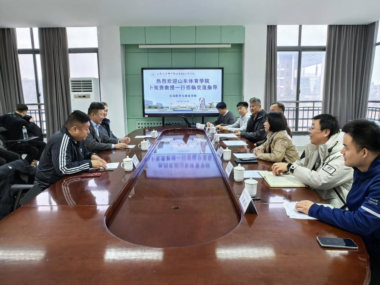 2026年1月6日下午,运动医学与康复学院与山东体育学院在长城路校区医学技术楼A326会议室举行交流座谈会。山东体育学院竞技体育学院教授卜宪贵、潘永生,国家足球学院教授袁航及优秀研究生代表,运动医学与康复学院院长贾庆卫、党委书记孙建翠以及学院专业负责人、科研秘书等共同参加活动。会议由运动医学系主任怀亮主持。